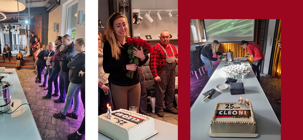 Naszą wdzięczność wyraziliśmy w formie pięknych kwiatów, które symbolizują naszą radość i szacunek. Dodatkowo, uświetniliśmy tę wyjątkową okazję przepysznym tortem, którego smak pozostanie w naszej pamięci na długo. Podczas toastu kieliszkiem szampana, podniesionego w atmosferze radości i dumy, zainaugurowaliśmy nowy etap w historii firmy Cleoni.
